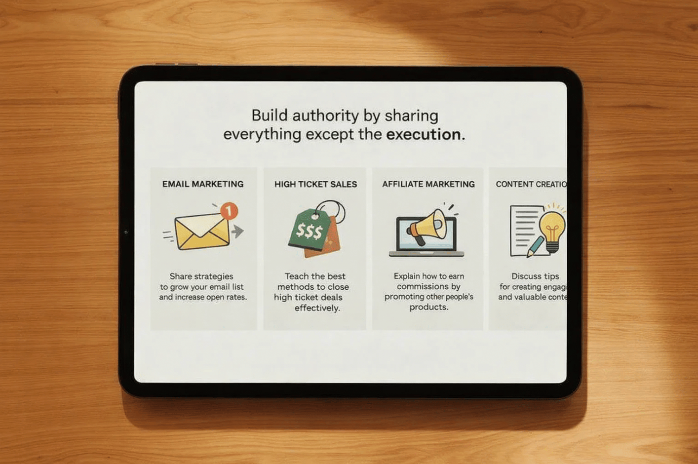 Blog posts. YouTube videos. Twitter threads. Newsletter issues. Give away the knowledge. Sell the implementation.