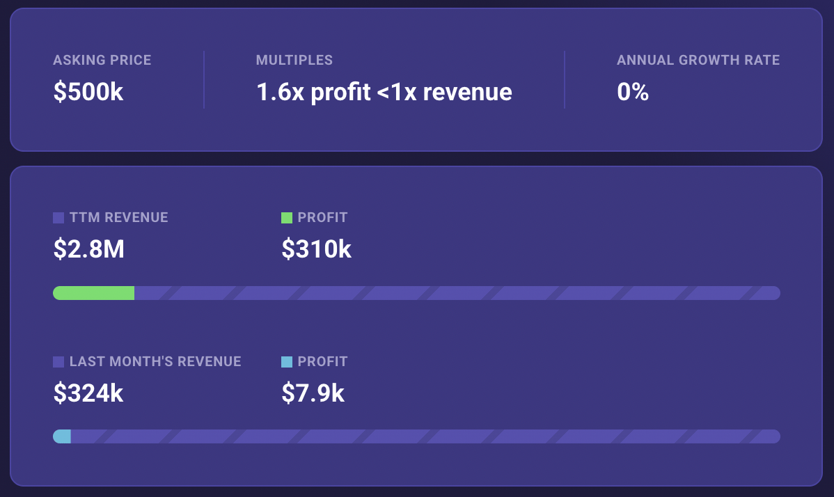 But the asking price is just $500K. That's 1.6x seller's discretionary earnings. Typical DTC ecommerce brands at this scale trade for 2-3x SDE. So what's wrong?