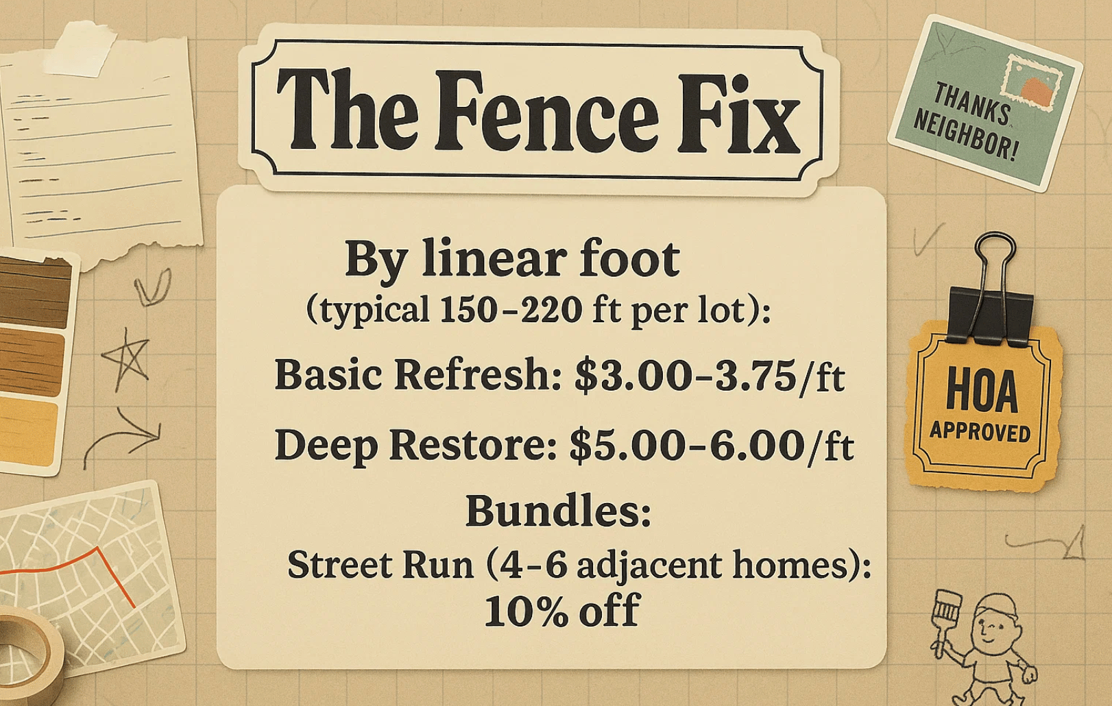 Prices are quoted by linear foot. Offer street run pricing when four or more adjacent homes schedule the same day. That lifts your margin because setup and masking time get shared. Add small upsells that feel helpful rather than pushy, such as new gate hardware, post caps, or an annual touch-up plan in spring.