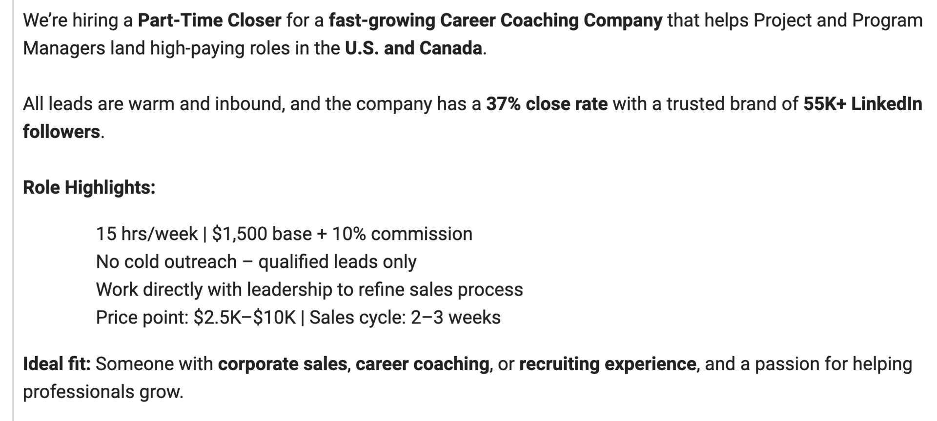 There are numerous roles posted on freelance sites. Search for “high-ticket sales” or “sales closer” on Upwork, LinkedIn, Indeed, Remote job boards, and niche Facebook groups.