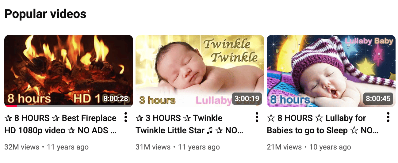 Youtube channel Lullaby Baby publishes ultra-long calming videos—8 to 10 hours of rain, fireplace crackle, white noise, and gentle lullabies—for overnight play and nap time. It’s built for maximum watch time and minimal friction.