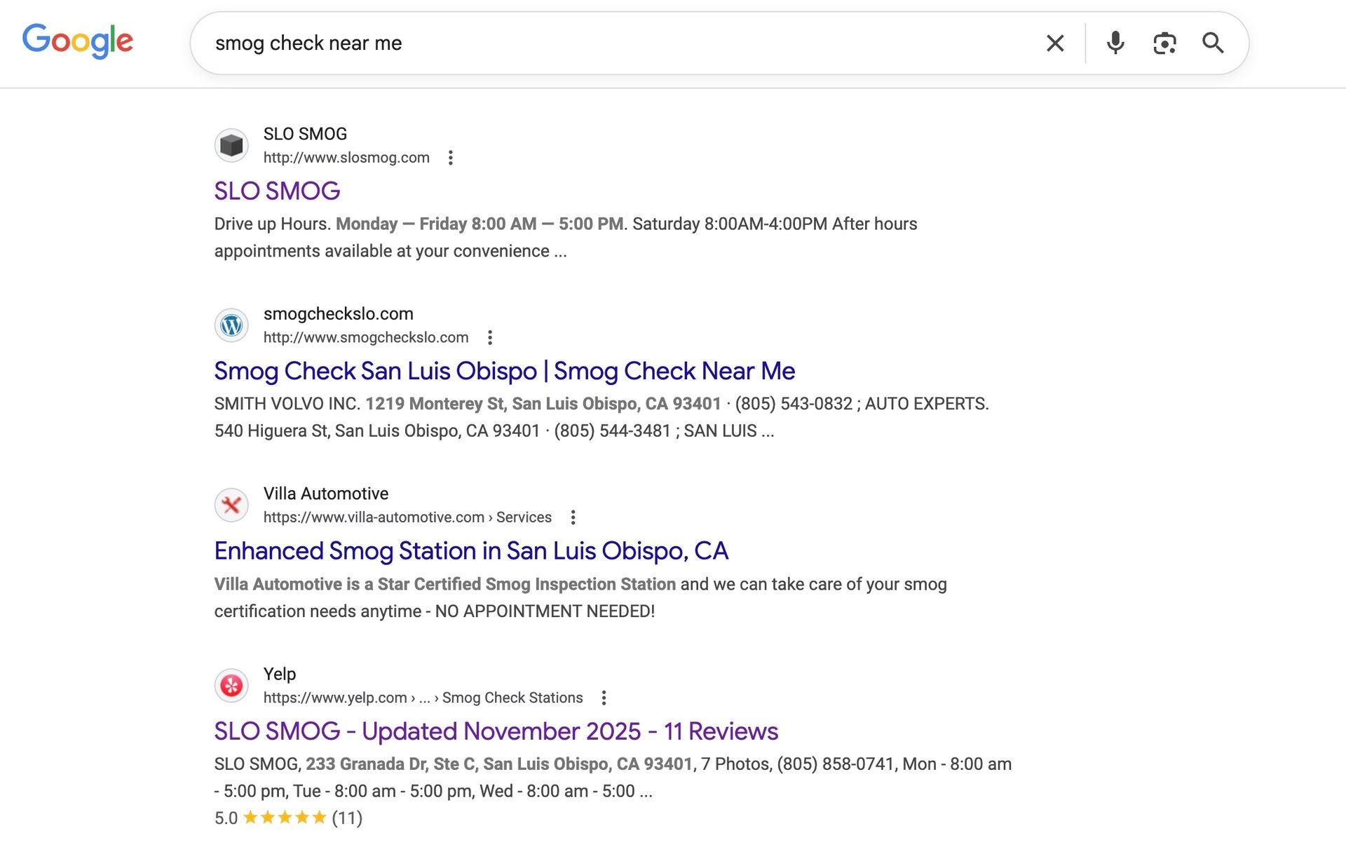 🚙 Why it Works: Smog checks are recurring, mandatory, and time-sensitive. Consumers want the closest, fastest option with a clear price and hours. Many shops are great at testing but weak at local SEO and landing pages. You become their always-on top-of-Google pipeline.