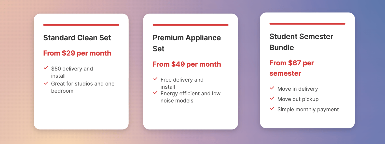 Offer a standard set for budget renters and a premium energy efficient set for people who want quieter cycles and lower utility bills. Keep pricing transparent and include a clear delivery and install fee that accounts for stairs and tight spaces. For students, sell semester bundles that include delivery at move in and guaranteed pickup at move out so parents never have to lift anything.